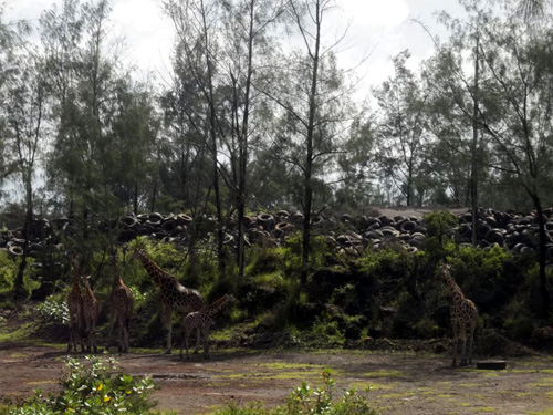 Ich versuche die Gedanken zu verscheuchen und beobachte die Krokodile, die unbeweglich mit geöffneten Mäulern im Grass liegen. Ein Mitarbeiter des Parks kommt auf uns zu und informiert uns, dass gleich die Giraffen gefuttert werden. Wir eilen in die gezeigte Richtung und erblicken die majestätischen Tiere mit den enorm langen Wimpern, ihr Gehege hat keinen Zaun, eine Seite ist mit alten Autoreifen versperrt. Ein Wächter verkauft kleine Tütchen mit Futter, die Touristen futtern die Giraffen selbst.