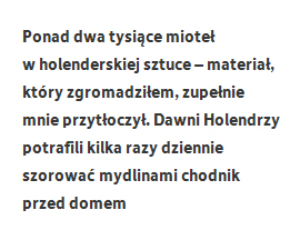 W dawnej holenderskiej literaturze i sztuce ciągle natrafiałem na wzmianki o porządku i sprzątaniu, których nie byłem w stanie zrozumieć, tym bardziej że obecnie w Holandii wcale nie jest aż tak czysto. Dziwiły mnie też miotły, nieustannie pojawiające się na obrazach, w grafice, a nawet na słynnych holenderskich flizach. Zacząłem szukać informacji, a gdy okazało się, że niewiele uwagi poświęcono temu zjawisku, sam zacząłem badania. Materiał, który zgromadziłem, zupełnie mnie przytłoczył, nie sądziłem, że będzie tego aż tyle! Ponad dwa tysiące mioteł w holenderskiej sztuce, a i tak to zapewne tylko ułamek. I dziesiątki tysięcy nawiązań do porządku w piśmiennictwie (komedie o sprzątaniu, XVII-wieczne poradniki dbania o schludność, niemal modlitwy o dobre sprzątanie, nawet piosenki o czystości). Dawni Holendrzy nie tylko potrafili kilka razy dziennie szorować mydlinami chodnik przed domem, ale łączyli sprzątanie z kwestiami moralności, patriotyzmu, tożsamości narodowej i religii. Opozycja pomiędzy brudem a czystością wpisała się też w ich kulturę i pojawiała się nieustannie, tak jak rozróżnienie pomiędzy złym a dobrym, ładnym i brzydkim czy dniem i nocą.