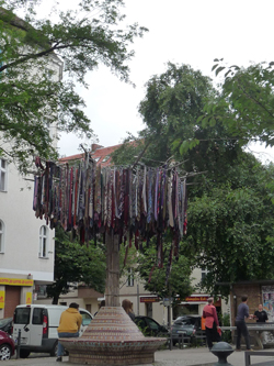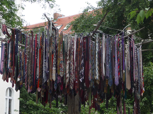 P1170191To drzewo krawatów jest dziełem Artusa Unival i umieszczone zostało przez artystę na Böhmischer Platz w Berlinie jako zachęta do dziwienia się – za mało się dziwimy, stwierdził Unival i powiesił na wieszaku 777 krawatów. Są one jednak również protestem. “Krawat symbolizuje człowieka władzy – bankiera, menadżera, inwestora. To oni sprawili, że Berlin, a teraz akurat okolica Richard Platz pada właśnie ofiarą gentryfikacji”.