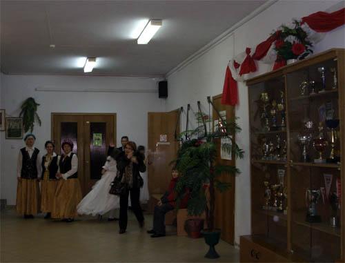 Do Lidy dotarliśmy o czasie, to znaczy krótko przed rozpoczęciem wieczerzy. Przed „Domem Polskim“ stało kilkanaście osób, jakby w oczekiwaniu na zaproszonych gości. Okazały budynek przypomniał mi, nie wiem dlaczego, staropolski zajazd. Jasnokremowa do połowy i ciemnoczerwona od połowy ( z dachem włącznie) fasada budynku przy pełnym jego oświetleniu symbolizuje barwy naszej flagi. Na łagodnie zaokrąglonych schodach, tuż pod łukiem wejścia, przywitała nas młoda, sympatyczna kobieta. Nad szklanymi drzwiami polski napis informuje, iż Dom ten należy do polskiej mniejszości narodowej zamieszkującej Lidę i okolice.