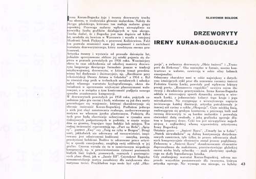 Pan Sławomir odzywa się już nazajutrz. Bombarduję go pytaniami. Ale już z maila wiem, że był to artykuł napisany na zlecenie redakcji “Przeglądu Artystycznego”. W następnym mailu pan Sławomir podaje nr czasopisma – 3 ( 19 ) z 1964 r. str. 43 – 45, przysyła skany i odpowiada na niektóre z moich pytań. Grafika Mamy była na wystawie. “W galerii nie było fotografii prac a ponieważ obojgu zależało nam na zdjęciach do numeru P.A. otrzmałem od p.Ireny kilka prac po zamknięciu ekspozycji dla sfotografowania w redakcji, pod warunkiem, że zadbam o ich odesłanie. Z czego jak Pani widzi wywiązałem się.”