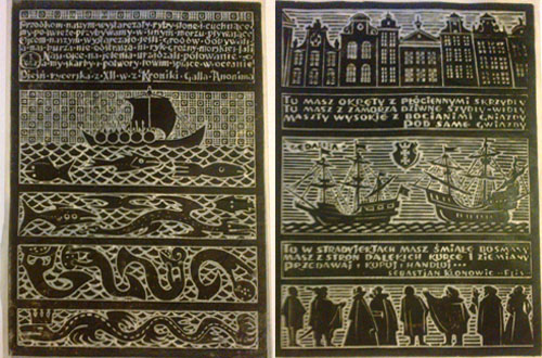 Powyżej dwie oryginalne grafiki Mamy z cyklu “Dzieje Gdańska”, jakie posiadamy w Berlinie – “Skarby i potwory” oraz (po prawej) “Gedania” z fragmentem poematu “Flis” Sebastiana Klonowica (1595):