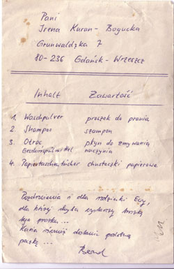 A tu spis zawartości paczki przysłanej przez przyjaciela z NRD, być może datujący, bo wydaje mi się, że Bernd przysyłał nam paczki tylko w czasie stanu wojennego.