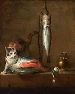 chardin-kot-rybyWłaściwie są to koty bardzo dramatyczne i, jak na dzisiejsze czasy, niemiłe do oglądania. Bo te koty pana Chardin łażą jak koty Gripsa po kuchni, ale kuchnia Gripsa jest sterylna, a kuchnia Chardina jest tłem dla rozpasanej orgii jedzenia, które się zaraz będzie spożywać, i to jedzenia połączonego z zabijaniem. Nie można mieć o to pretensji do Chardina. Inni też tak malowali.