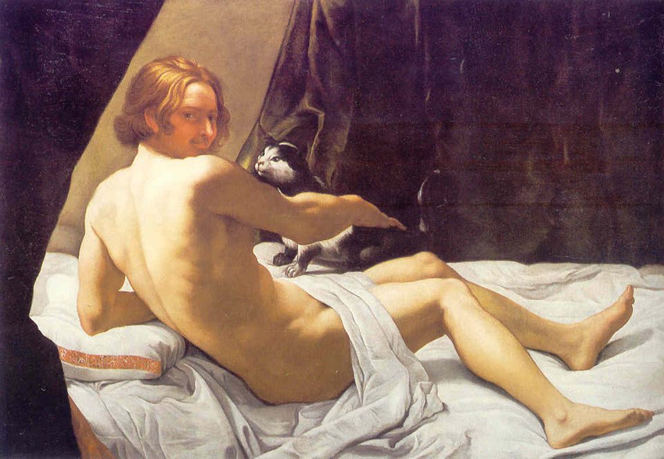 Poniżej też kotek, i też w łóżku, ale tym razem z panem. Giovanni Lamfranco. 1582-1647. Włoch, późnorenesansowy czy też jak chcą krytycy protobarokowy, a człowiek głowę by dał, że manierystyczny w stylu prerafaelitów, a może nawet całkiem współczesny i tylko z lekka stylizowany na manieryzm. Myli zwłaszcza szelmowskie spojrzenie młodego pana i tematyka, zupełnie niepodobna do tego, jak artysta malował oficjalnie – słynął bowiem z monumentalnych fresków, malowideł na plafonach, sufitach i kopułach oraz ołtarzy o tematyce nadzwyczaj religijnej. I tu nagle młody nagi pan w łóżku. Z kotem. 1620 rok. Dziś w Londynie, w zbiorach Walpole Gallery. Obraz, który skłania krytykę do wysuwania niedwuznacznych domniemywań. Ale w dziele artysty nie ma innych obrazów, które potwierdzałyby te przypuszczenia, nic też nie zachowało się w dokumentach.