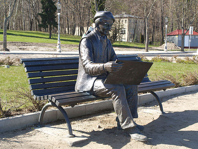 Wikipedia pisze, że Antoni Suchanek (1901-1982) był jednym z najwybitniejszych polskich malarzy-marynistów. Poniżej ławeczka z rzeźbą, przedstawiającą artystę, ustawiona w pobliżu mola w Orłowie. Autorem zdjęcia jest Orem, niestety nigdzie nie znalazłam informacji, kto jest autorem pomnika.