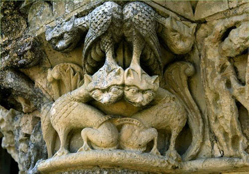 i opatrzyła go takim mniej więcej podpisem: koci (?) kapitel w St. Martin w Poitou-Charentes, połowa XII wieku. Zaiste, trudno ocenić, czy te zwierzęta na kapitelu to psy (gończe na przykład), gryfy (te potwory ze skrzydłami na górze), koty czy lemury, a może nawet gollumy? Nie wiem. Ale też nie wiem, czy chodzi o jakiś kościół św. Marcina w departamencie w Poitou-Charentes czy o miasto San Martin de Re tamże? A jak kościół – to który? Bo mógłby to być kościół Fontaines d’Ozillac Saint Martin – datowanie się zgadza i dziwaczne zwierzęta w kapitelach też, ale tych kotów się nie doszukałam. Jeśli to jednak ten kościół to jest on swoistą ciekawostką. W XV wieku trzeba go było rozbudować, z boku doklejono mu więc dodatkową nawę z renesansowym portalem. W XIX wieku dobudowano jeszcze wieżę z drugiej strony.