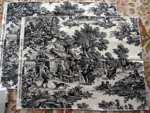 Dopiero we wpisie o Jouy-en-Josas pojawi się dodatkowa informacja o tkaninach Oberkampfa, ale nadal bez obrazków: Toile-de-Jouy (płócienko z Jouy) oznacza  tkaninę bawełnianą z nadrukami. Klikam na tego linka i dopiero tu znajduję to, co widziałam już przecież w gazetce, wiem więc czego szukam. Obok płócienko Oberkampfa. Poniżej moja serwetka od Ani, a pod spodem nadesłana dwa dni później fota “Oberkampfa” od Powsinogi.