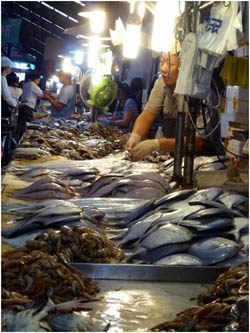 W programie wycieczki jest zwiedzanie rynku i wspólne gotowanie obiadu z chińską rodziną. Po zwiedzaniu rynku apetyt niestety wszystkim przechodzi – opuszczamy rynek w stanie szoku, mając przed oczami te worki żywych żab skaczących po ladzie, niezidentyfikowane gatunki mięsa (psów i kotów na ulicach niewiele!) i ryb, mózgi, podroby, nigdy jeszcze nie widziane owoce i warzywa. „Rodzina” to, jak się okazuje, mieszkańcy wzorowej komuny zbudowanej w końcu lat 70 dla pracowników napływowych z prowincji. Przed obiadem oprowadzają nas po muzeum, pokazującym z dumą, jak wielką szansę życiową otrzymali oni od państwa chińskiego. Wśród eksponatów: racjonowane słodycze marki „White Rabbit” i stojące w każdym mieszkaniu maszyny do szycia, na których z przydziałowego materiału rodziny szyły sobie obowiązujące w całych Chinach mundurki w trzech kolorach: czarnym, szarym i niebieskim. Patrząc na zdjęcia tych szczęśliwych ludzi myślę o rolniku Wang Lung z książki Pearl S. Buck Łaskawa ziemia, który w sto lat przed stworzeniem przez Mao tego „raju dla klasy chłopskiej i robotniczej”, w czasie nieurodzaju jadł dla zabicia głodu ziemię. Czy czułby się w tej komunie szczęśliwy? Pod koniec zwiedzania pada żenujące pytanie: „Czy chcecie zobaczyć film propagandowy z tamtych lat?” Sytuację ratuje Erich – nauczyciel z Szlezwika-Holsztynu zapewniając oprowadzających nas przewodników, że właśnie po to przyjechaliśmy do Chin, żeby poznać historię tego wspaniałego kraju, ale niestety nieznajomość języka uniemożliwi nam zrozumienie filmu. Jedzenie przygotowane przez rodzinę (widzieliśmy tylko panią domu – 52-letnią emerytkę – w Chinach kobiety pracujące fizycznie przechodzą na emeryturę w wieku 50 lat, mężczyźni w wieku 55 lat) było fantastyczne. Mieszkania nam nie pokazano, otrzymaliśmy tylko informację, że w trzech pokojach mieszka małżeństwo z synem i teściową.