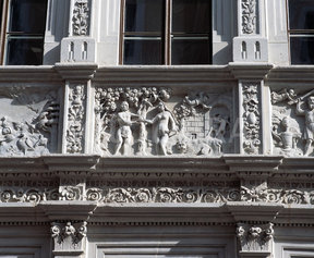 Dom Biblijny na zgorzeleckiej Starówce. Cała fasada gęsto pokryta scenami ze Starego i Nowego Testamentu. Tu akurat Grzech Pierworodny.
