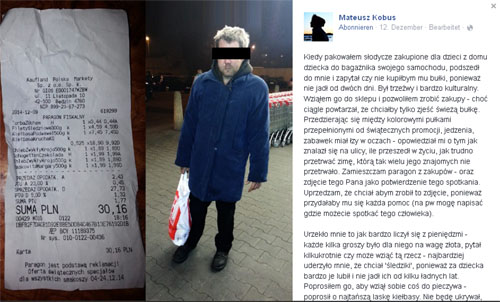 Jakiś czas temu zwróciła moją uwagę notatka na Facebooku, o tym, że ktoś okazał dobre serce i kupił jedzenie bezdomnemu pod Tesco. Rzecz wydawała mi się chwytem marketingowym. Napisałam o tym TU. 9 grudnia pojawił się na Facebooku podobny wpis, tym razem z Będzina. Wpis opowiada identyczną historię, mam wrażenie, że nawet w podobnych zdaniach i z użyciem podobnych chwytów stylistycznych i słów. Podobne słowa powtarzają się też w komentarzach, zdecydowanie przeważają szacun i szacunek.