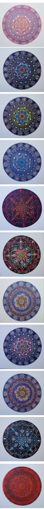 Jolanda Jeklin regards the ‘Mandala’ as a sort of medium between the human and the world which vibrates around him, penetrating him. That is, at the same time, a reference to the process of meditation and focusing, allowing for auto-analysis and a coming closer to one’s own interior or recognizing one’s individual aims, but also to that which helps us fulfill those aims and what hinders us in fulfilling them and at the same time what draws us apart from one another.