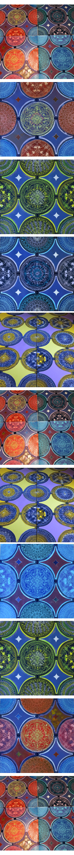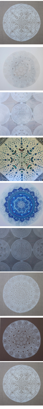 Just as the disturbing torsos of androgenic figures are a metaphor of anonymity and lack a stable definition of the “I”, the feerical, cobalt-turquoise mandalas bring to mind the charm of oriental baths and escapist memories or perhaps dreams. Pulsating with a centripetal rhythm, they also document a persistent search for relief – a mental center.