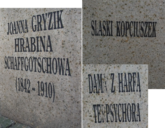 Większość tych rzeźb widziałam już kilka lat temu, ale widocznie nieuważnie patrzyłam, bo nagle kawałeczek dalej, wśród muz, jako muza Terpsychora, pojawia się pomnik pięknej pani z harfą, którego przed kilku laty nie widziałam, a na pewno już tu stał.