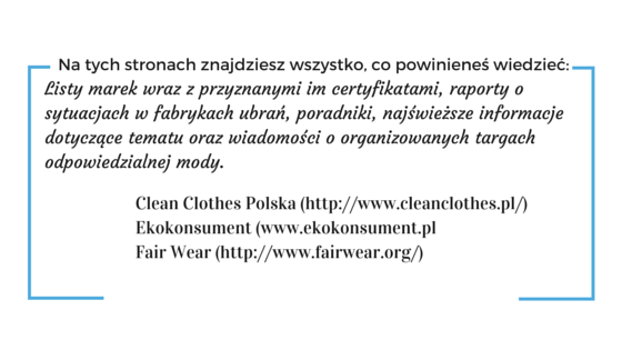 Nie bój się szukać. Internet to kopalnia wiedzy o produkcji ubrań. Wszystkie zrzeszenia i organizacje walczące o godziwe wynagrodzenie i warunki pracy udostępniają swoje materiały dla każdego.