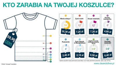 Większość ubrań na sklepowych półkach łączy jedno: miejsce produkcji nadrukowane na metce. Często to, co kończy zdanie „Made in…” kryje za sobą nieludzkie warunki pracy i nieprawdopodobnie niskie wynagrodzenie. Najczęściej dotyczy to Turcji, Europy Wschodniej i Azji. Przykładowo, z takiej koszulki uszytej w Bangladeszu i sprzedawanej za 59 złotych, 39 złotych dostaje sklep, 40 groszy – szwaczka, resztę zabiera producent.