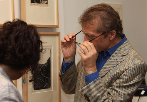 Auf dem Foto Richard Stratenschulte, Pressesprecher der Museen der Staat Dresden, vor den expressionistischen Linolschnitten von Stefan Szmaj.