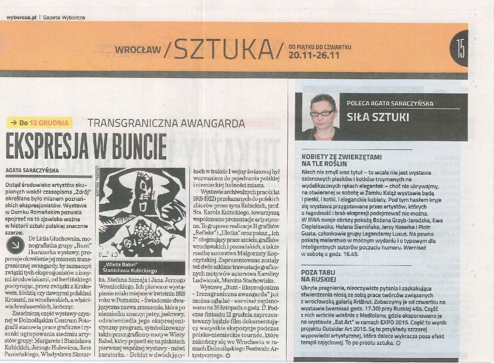 In Wroclaw it should be especially mentioned, that the first expressionist linocuts of the “Bunt” circle, among them The Tower of Babel from the poster of its first exhibition, were created by Stanisław Kubicki in Schömberg/ Chełmsko Śląskie, Silesia.