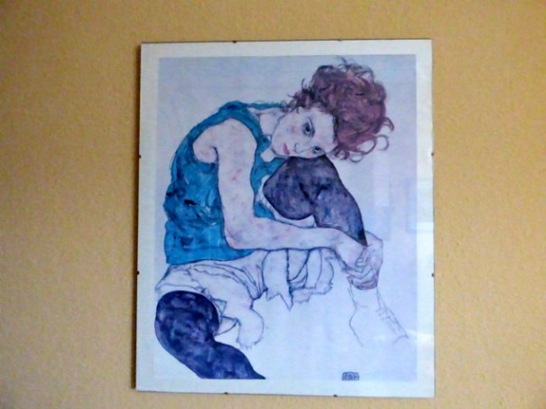 Tak, tak, to właśnie jestem ja na tym obrazie! – dalej tak uważam. To dziwne, że wśród wielu reprodukcji obrazów zdobiących ściany mojego mieszkania, a są tu i dawni mistrzowie, Klimt, Munch, Van Gogh, Monet, Matisse, Gaugain, Modigliani, Botticelli, i współcześni mi artyści berlińscy, których znam osobiście jak Woźniewska, Fiszbach, Piwarski, Dybowski, Olbiński, Nawrocka, Betlińska, na najbardziej wyeksponowanym miejscu wisi ten właśnie obraz: Egon Schiele Siedząca kobieta ze zgiętym kolanem.