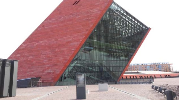 Mnie udało się obejrzeć Muzeum w przeddzień otwarcia wystawy, Ania dotarła tam w dzień po. Ani udało się więc obejrzeć wystawę, ja musiałam poprzestać na fotografowaniu dekonstuktywistycznej bryły muzealnej, która jest dziełem gdyńskiego studia architektonicznego Kwadrat. Autorami projektu są Jacek Droszcz i Bazyli Domsta.