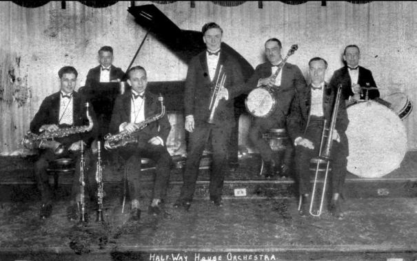 Four New Orleans Jazz Babies at Halfway House, ca. 1920. L-R: Emmett “ Buck” Rogers, Abbie Brunies, Mickey Marcour and Stalebread Lacoume. The photo was taken at the Halfway House and it may have been the first group that Abbie had there. Abbie would stay for many years at the Halfway House and the combination was to become famous among collectors of early jazz.