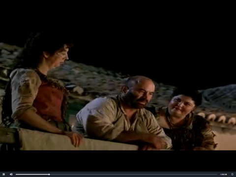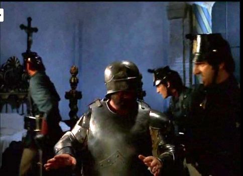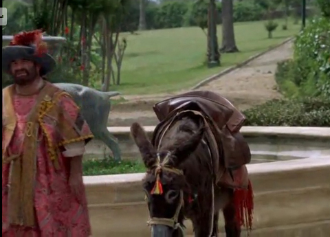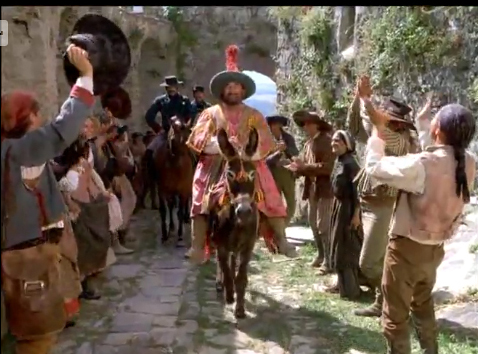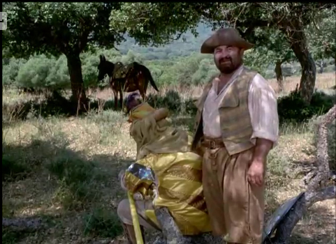 Wikipedia twierdzi, że Sancho Pansa w pierwszej części powieści jest postacią raczej komiczną i dopiero w drugiej otrzyma pogłębioną charakterystykę, przestaje być śmieszny, staje się człowiekiem mądrym i sarkastycznym. Filmowy Sancho Pansa godzi się na wyprawę z Don Kichotem, bo w domu plącze się z pół tuzina dzieci, żona jest wprawdzie ładna, robotna i zaradna, ale goni męża do roboty, a teściowa zrzędzi. Ale mądry i dowcipny jest już wtedy, gdy dopiero szykuje się do pierwszej swej przygody.