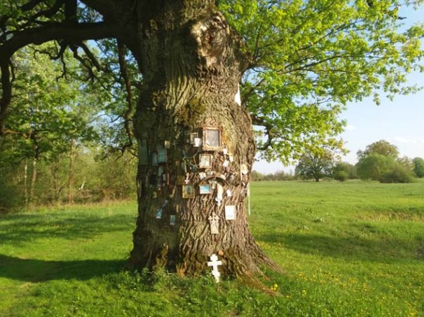 Pierwsze, co w Jabłecznej rzuciło się Viatorce w oczy, a czego (o dziwo), zmęczony już chyba podróżą Viator nie zauważył, to wielki, rozłożysty dąb, obwieszony ikonkami, krzyżykami i czotkami (czyli czymś w rodzaju prawosławnego różańca, takiego bardziej jezusowego niż maryjnego). To drzewo wotywne, na którym swe dary w intencji wysłuchania modlitw, albo już wdzięczni za ich wysłuchanie, pozostawiają pielgrzymi.