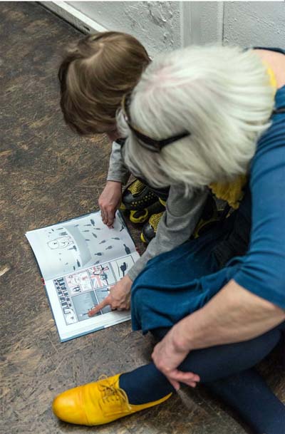 Wyalienowani z rozentuzjazmowanego tłumu, babcia i wnuczek, oboje w żółtych butach, podczas wielkiego wernisażu. Zajmujemy się sprawamy wyższymi, choć siedzimy najniżej.