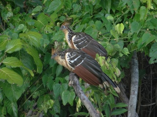 Siedzimy na zbitej z desek platformie, którą transportują dwie łodzie i przyglądamy się budzącej się dżungli. Na brzegu widzimy stada małp buszujących po wierzchołkach drzew, oprócz hoacynów słyszymy i widzimy dziesiątki innych ptaków, pobyt nad laguną kończy krótkie spotkanie z kajmanem, wygrzewającym się na brzegu na słońcu. „Szkoda, że niedługo wracamy do cywilizacji”, myślę patrząc na ten raj.