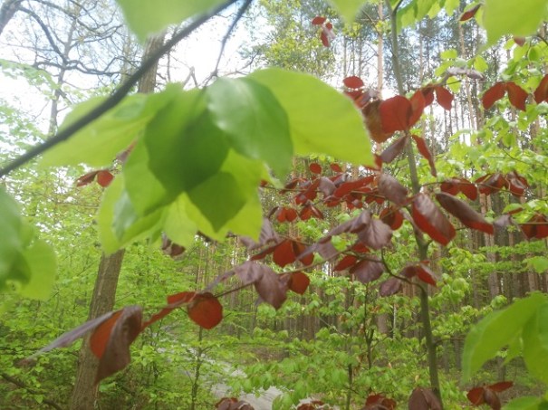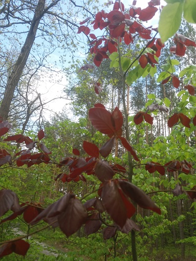 Aha, już wiem! Buk. Młody buczek właściwie. Tyle, że w odmianie czerwonej. Czyli ozdobnej, hodowlanej. A las naturalny. No, może nie dziki, bo ręką ludzką sadzony. Jednak okazów parkowych w nim nie uświadczysz.