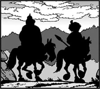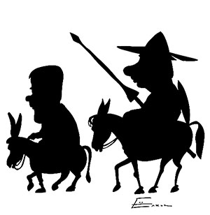 A ja na to – nic, bo nie (rozpo)znałam. Ale wiedziałam, że A ma rację, Don Kichot jak żywy, choć gruby, Sancho Pansa też jak żywy, choć z lancą, obaj przyodziani w czapy z futrzanym obramieniem. Jak przestałam już (choć nie nadaremno – patrz niżej) szukać w różnych językach pod hasłem Don Kichot i Sancho Pansa, rysunek, czarno-biały, tatarski, mongolski i Dżyngiz Chan, to zaproponowałam A grę w 20 pytań. Zużyłam pięć pytań – pierwsze brzmiało, czy to Mongołowie? – i wiem. Jeśli nie wiecie, to zobaczcie TU.
