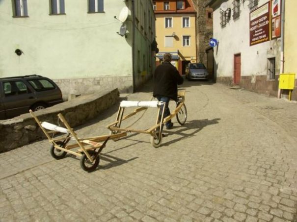Żona wysłała mnie po jajka. Chciała żebym pojechał pociągiem. Słucham kobiet, a w szczególności żony, ale robię po swojemu. Tym razem to był błąd. Ale po kolei. Miałem kupić dwadzieścia dwa jajka, dwanaście do naszego pojemnika i dziesięć w standardowym opakowaniu. Wziąłem wózek o wdzięcznej nazwie „Zapilux” i o czwartej rano ruszyłem w stronę Bystrzycy Kłodzkiej. Szło się rewelacyjnie. Zawsze miedzy czwartą a dziesiątą rano idzie się rewelacyjnie, bez odpoczynku, bez picia i bez jedzenia. Na miejscu byłem około ósmej. Kupiłem od znajomego jajka, wypiliśmy kawę, trochę pogadaliśmy i ruszyłem w drogę powrotną. Nie lubię wracać tą samą drogą. Do Bystrzycy Kłodzkiej szedłem przez Kłodzko, Krosnowice, Gorzanów Zabłocie, a z powrotem przez Stary Waliszów, Romanowo, Trzebieszowice. Szło się trochę gorzej zaczęły się przerwy na odpoczynek. W pewnym momencie uświadamiam sobie, że wprawdzie zapłaciłem za 22 jajka, ale zapomniałem 10, tych w pudełku. No trudno. Nie będę wracał. W Ołdrzychowicach nad rzeką było zejście do wody. Postój i moczenie nóg. W drodze staram się jak najczęściej myć nogi i sandały. W pewnym momencie do wody podchodzi kobieta z wiadrami. To pana wózek? Mój. Skąd pan idzie? Z Bystrzycy. A dokąd? Do Kłodzka. A wstąpi pan na kawę? A wstąpię.