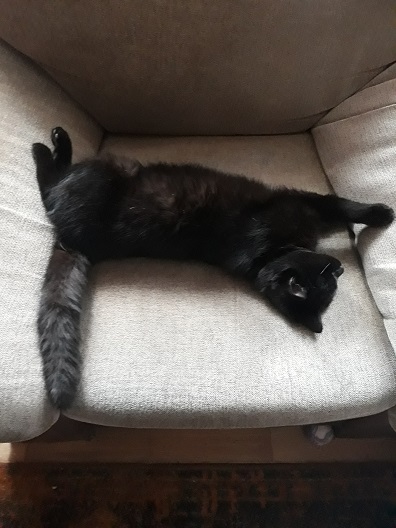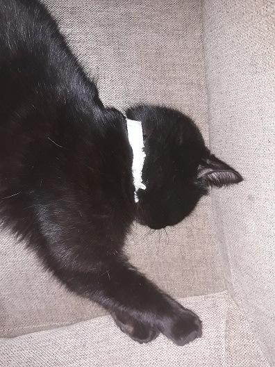 Ileż ten nieszczęśnik musiał przejść! Gdy tak leży rozwalony na fotelu, na którym już oczywiście nie ma miejsca dla mnie, widać wyraźnie, że stracił (zgubił, zniszczył?) swą czerwoną obróżkę i sąsiedzi, który zdecydowanie wciąż uważają się za jego państwo i właścicieli, zawiązali mu wokół szyli jakąś szmatkę czy tasiemkę. Diabli wiedzą co to, ale na pewno szczęścia mu tym nie przysporzyli.