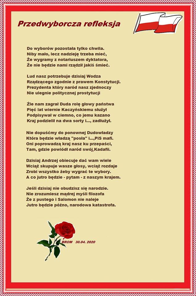 kiedy w latach osiemdziesiątych pisałem paszkwile przeciwko ówczesnej, komunistycznej władzy, kiedy udawało nam się (mi i moim przyjaciołom) mimo strachu rozwiesić na ścianach kopalń czy obiektów publicznych napawające otuchą nasz naród, patriotyczne (dla władz antypaństwowe) wiersze, byłem szczęśliwy. Wówczas wiedziałem, że to ma sens. Nawet wtedy, gdy musiałem w 1987 roku uciec przed organami SB z kraju, nie wątpiłem, że warto było walczyć słowem poezji, gdyż naród był jednością, był jedną wielką doświadczaną przez tragiczny los rodziną.