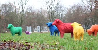 Kleine gewundene Steinwege, hie und da mit bunten Kachelsteine inkrustiert, ganz im spanischen Stil, führen zu den Thronsesseln für die Fürstin und ihren Herr Gemahl. Mitten in einer Steinspirale steht ein Windrad, um ihn herum sind kleine Gräber voller bunter Windräder platziert, dahinten auf der Wiese stehen farbige Schafe. Heute sind sie pastellfarben, aber auf einem Foto aus dem Flyer sieht man, dass sie Mal starke, kräftige Farben hatten.