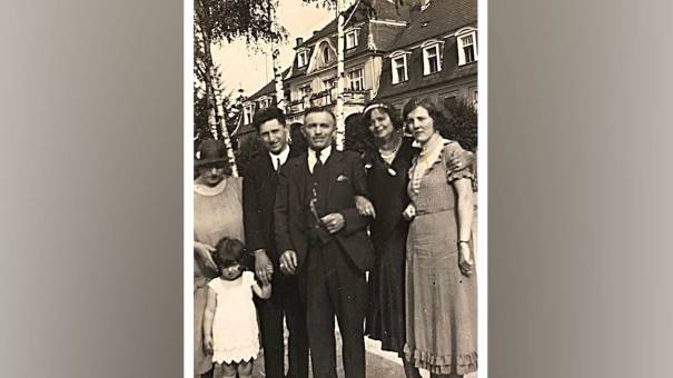 Karolina mit ihren Eltern Richard und Else (links) im hessischen Bad Orb 1932. In der Mitte Elses Bruder Max Eisemann, ermordet in Majdanek 1943.