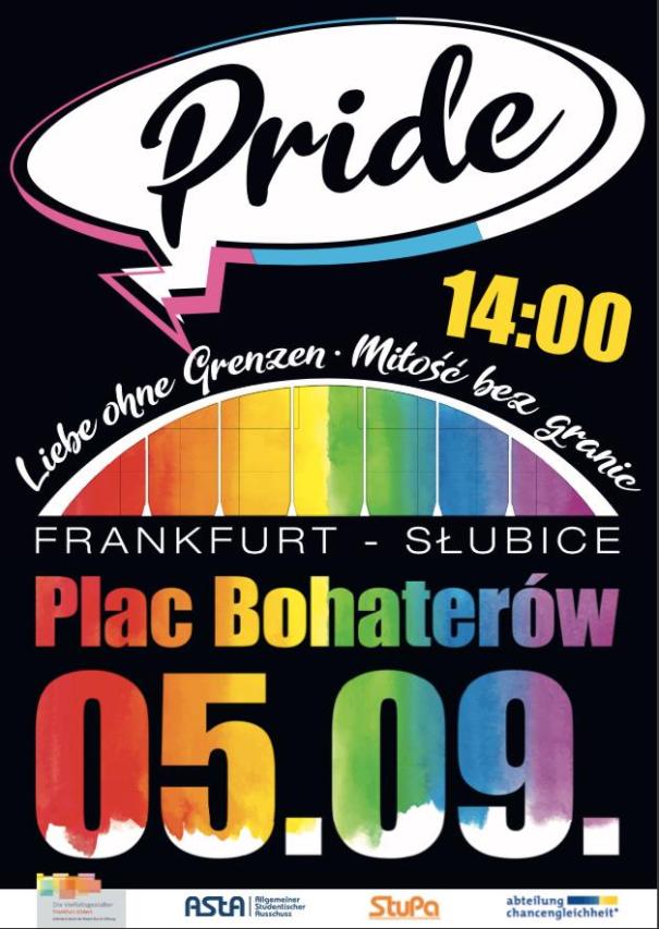 Unter dem Motto „Liebe ohne Grenzen“ findet am Samstag, dem 5. September 2020, ab 14.00 Uhr in der Doppelstadt der erste Frankfurt-Słubice-PRIDE statt. Die Demonstration will einerseits auf die kaum bis gar nicht vorhandene Sichtbarkeit und Infrastruktur für queere Menschen in beiden Teilen der Doppelstadt aufmerksam machen. Zweiter Schwerpunkt ist die Solidarisierung mit der LGBTIQ*-Community in Polen, die durch sogenannte „LGBT-freie Zonen“ in einigen Kommunen sowie durch hetzerische Kampagnen, u. a. durch die Regierungspartei PiS im jüngsten Präsidentschaftswahlkampf, heftig diskriminiert und bedrängt werden.