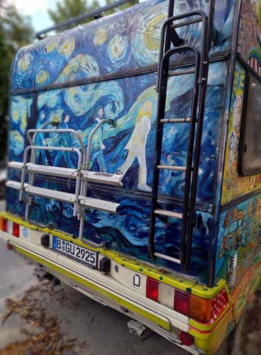 Auto stoi gdzieś na Charlottenburgu, nigdy nie jeździ, choć czasem ktoś je przestawia z jednej strony ulicy na drugą. Zostało kiedyś pomalowane tak, jak 50 lat temu malowali swoje auta hippisi. Ale wydaje mi się, że zostało tak ozdobione co najmniej 20 lat później. Zastanawiam się, czy należy do kogoś z Polski, bo wśród różnych ezoterycznych i ajurvedycznych symboli, wśród memów współczesnej popkultury jak van Gogh, dinozaury czy Hitler, można też znaleźć Bolka i Lolka.