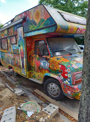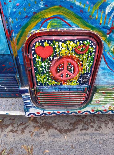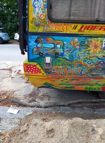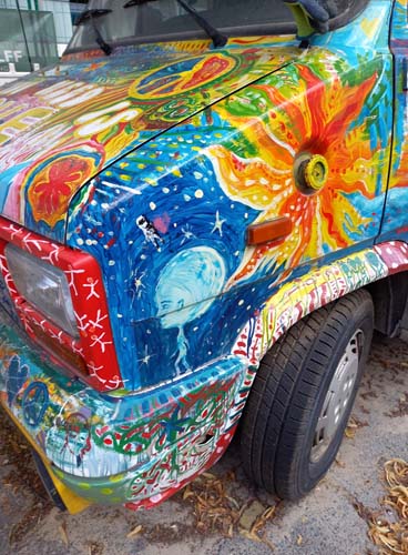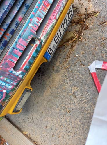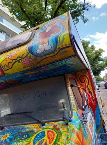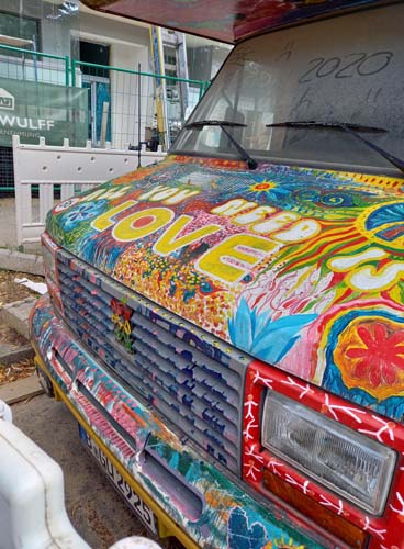 Auto stoi gdzieś na Charlottenburgu, nigdy nie jeździ, choć czasem ktoś je przestawia z jednej strony ulicy na drugą. Zostało kiedyś pomalowane tak, jak 50 lat temu malowali swoje auta hippisi. Ale wydaje mi się, że zostało tak ozdobione co najmniej 20 lat później. Zastanawiam się, czy należy do kogoś z Polski, bo wśród różnych ezoterycznych i ajurvedycznych symboli, wśród memów współczesnej popkultury jak van Gogh, dinozaury czy Hitler, można też znaleźć Bolka i Lolka.