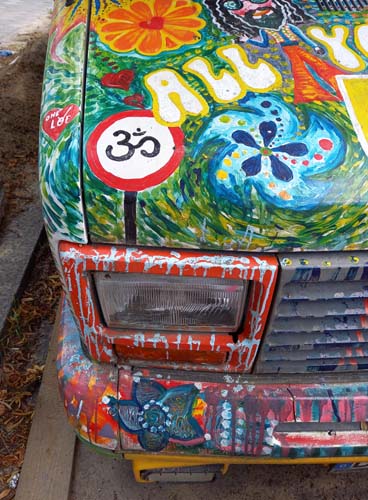 Das Auto steht irgendwo in Charlottenburg und kein Mensch scheint es zu benutzen. Jemand stellt es aber ab und zu von einer Straßenseite auf die andere. Und jemand hat sich irgendwannmal Mühe gegeben, um es so liebevoll hippiearrtig zu bemalen. Man kann da Vieles entdecken, Symbole Aiurvedischer Medizin und van Gogh, Ganesh und zwei lustige Bengel aus polnischen Kinderfilme aus den 70ern: Bolek und Lolek, die auf Deutsch in der umgekehrten Reihenfolge Lolek und Bolek heißen. Ich glaube auch, Hitler gefunden zu haben.