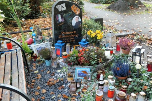 Pod wielkimi płaczącymi bukami jest grób inny od wszystkich, kolorowy, z popielniczką i butelką piwa, z puszkami ze sprayem i pisakami, na zniczach różne napisy. Yanneck miał 18 lat, gdy zginął wraz z kolegą podczas sprajowania kolejki miejskiej. Yanneck był artystą graficiarzem. Koledzy graficiarze bardzo dbają o mur cmentarny.