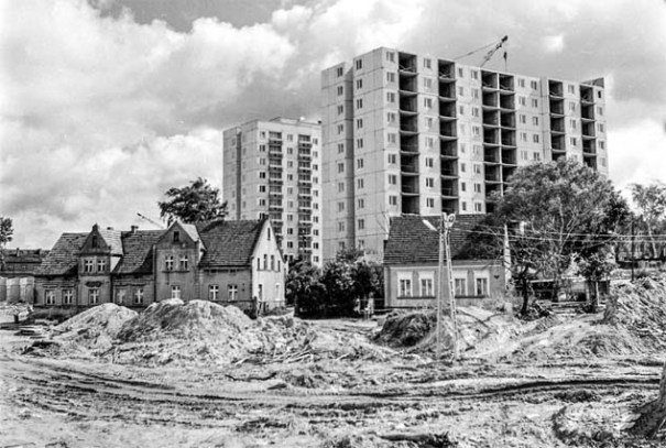 Nowe bloki. I raczej szare, bo sklecone tak na szybko z betonowych płyt (zwanych nawet „wielką płytą”). Niskie, czteropiętrowe, są bardzo proste i bardzo długie. I przy tych ich kilkunastu klatkach schodowych i jednostajnym, wydłużonym kształcie, bez żadnych załamań czy skosów, wydają się takie niskie, jeszcze niższe niż te cztery piętra.