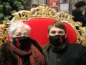 Zdjęcie matrony i młodziana na tronie w sklepie Karstadt w Berlinie w grudniu 2020 roku, wieczorem ostatniego dnia przed lockdownem. Kupiliśmy marmoladę i herbatę, i tak to nas zmęczyło, że musieliśmy odpocząć. A że akurat stał tron…