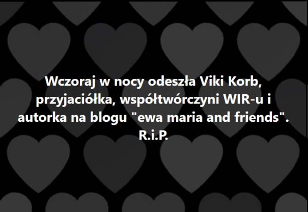 Wiki współpracowała ze mną w WIRze, a gdy z publikacji na papierze przerzuciłam się na almanach kulturalno-społeczny na blogu, współpracowała ze mną na wszystkich moich kolejnych blogach, na Kurze, Qrze i tu, czyli u ewymarii. Wpisy z Kury i Qry zniknęły, gdy Agora, która prowadziła blox.pl, po prostu wyrzuciła miliony wpisów w przestrzeń kosmiczną. Tu można je wciąż jeszcze czytać. Po prostu wpiszcie w wyszukiwarkę jej imię i nazwisko: Viktoria Korb.