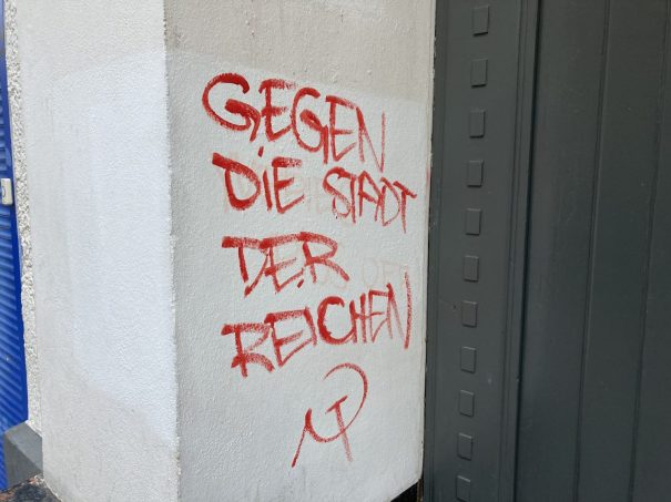 Eine „Free-Box“ mit alten Büchern, Klamotten und Dingen des täglichen Gebrauchs steht in der Pflügerstraße. Wir kommen an Häusern vorbei, an denen Transparente gegen die neuen Eigentümer hängen. Neben einem Spielplatz ist ein weiteres Obdachlosenlager aufgebaut, auf den Fassaden bemängeln revolutionäre Sprüche den Wandel der Stadt.