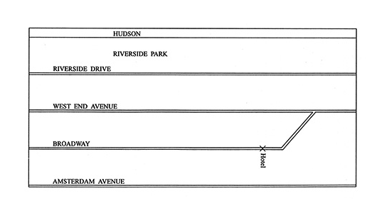 Diagram wyglądał trochę jak mapa urojonego stanu, który można by pewnie jakoś wklinować między dwa już istniejące na Środkowym Zachodzie. Tego dnia Stillman ruszył prosto do Riverside Drive, skręcił w stronę Harlemu, minąwszy jedenaście przecznic, zrobił w lewo zwrot i wszedł do parku, gdzie zaraz zawrócił na południe. Figura, którą nakreślił, byłaby prawie idealnym, wąskim prostokątem, gdyby pominąć nitkę między Broadwayem a Riverside Drive, parę lekkich zygzaków w parku oraz to, że kilkakrotnie okrążył pomnik żołnierzy i marynarzy, jakby stawiał kropkę nad – a raczej pod – I. Wrócił do hotelu prawym chodnikiem Riverside Drive.