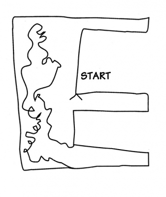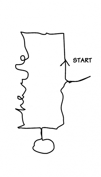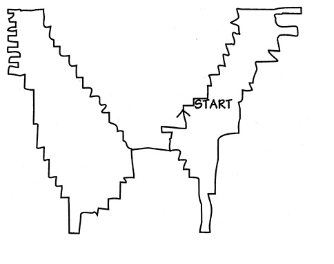 Potem uważnie przejrzał notatki i zaczął nanosić długopisem trasę, którą starzec przebył w ciągu jednego dnia – tego właśnie, gdy Quinn postanowił dokładnie odnotować wszystkie meandry jego wędrówki. Wynik był następujący: