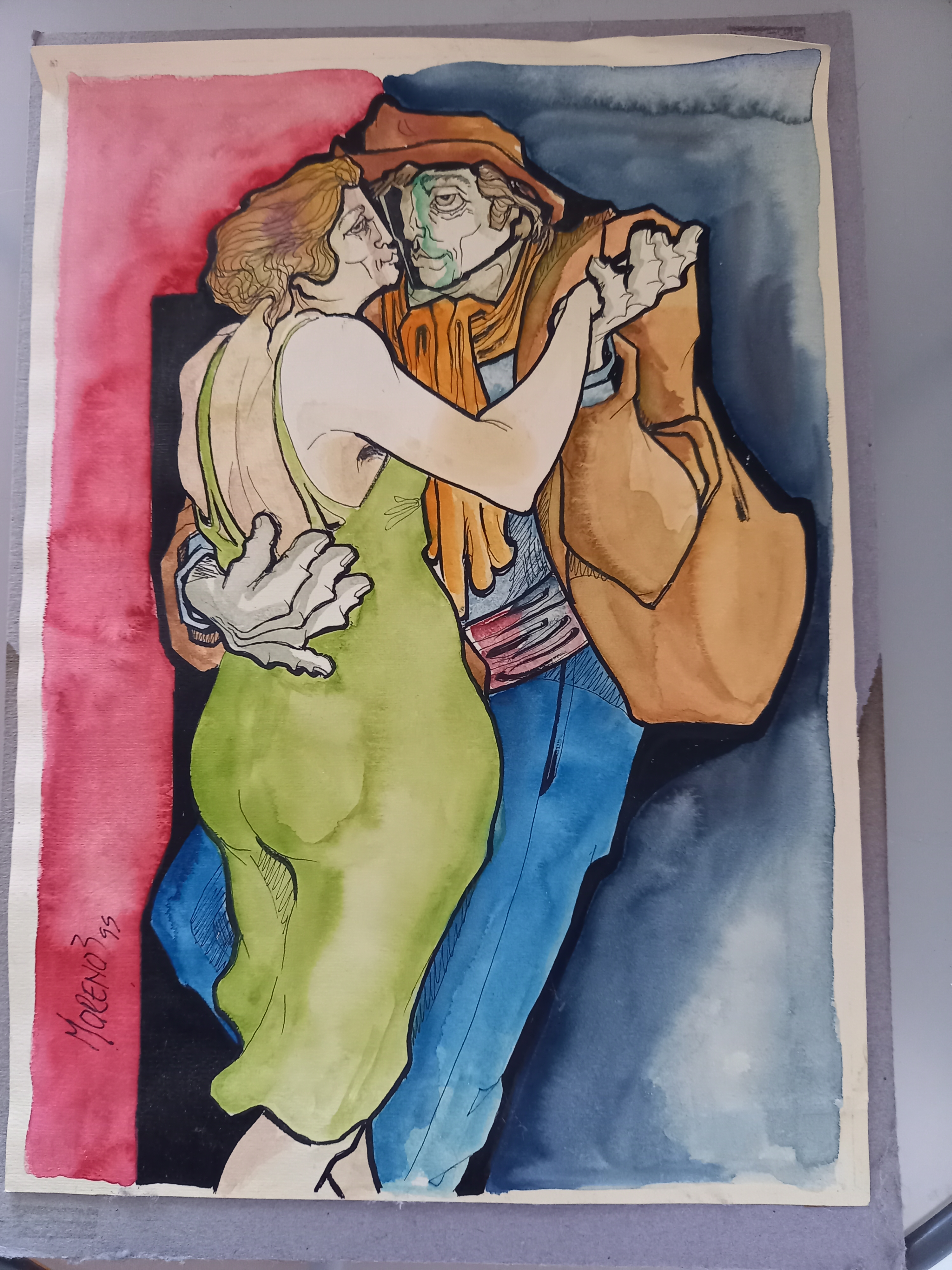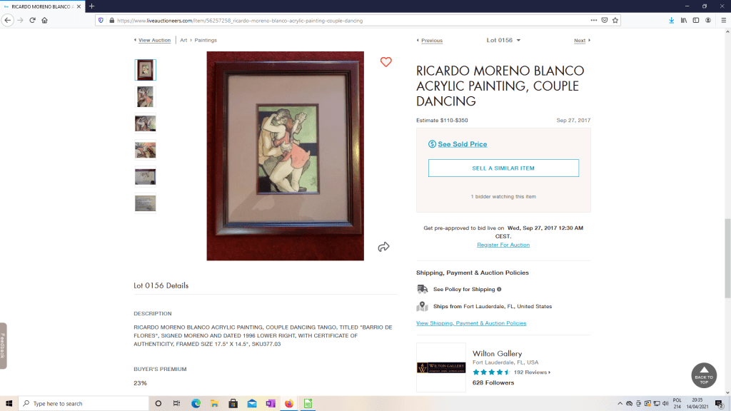 Wystarczy wpisać w googla imię i nazwisko artysty, a natychmiast pojawiają się jego dzieła, głównie malarstwo (akryl) z przyjemną adnotacją “sold”. Tematyka podobna do mojego znaleziska – tańczące tango pary. O proszę, na przykład tu: https://www.liveauctioneers.com/item/56257258_ricardo-moreno-blanco-acrylic-painting-couple-dancing