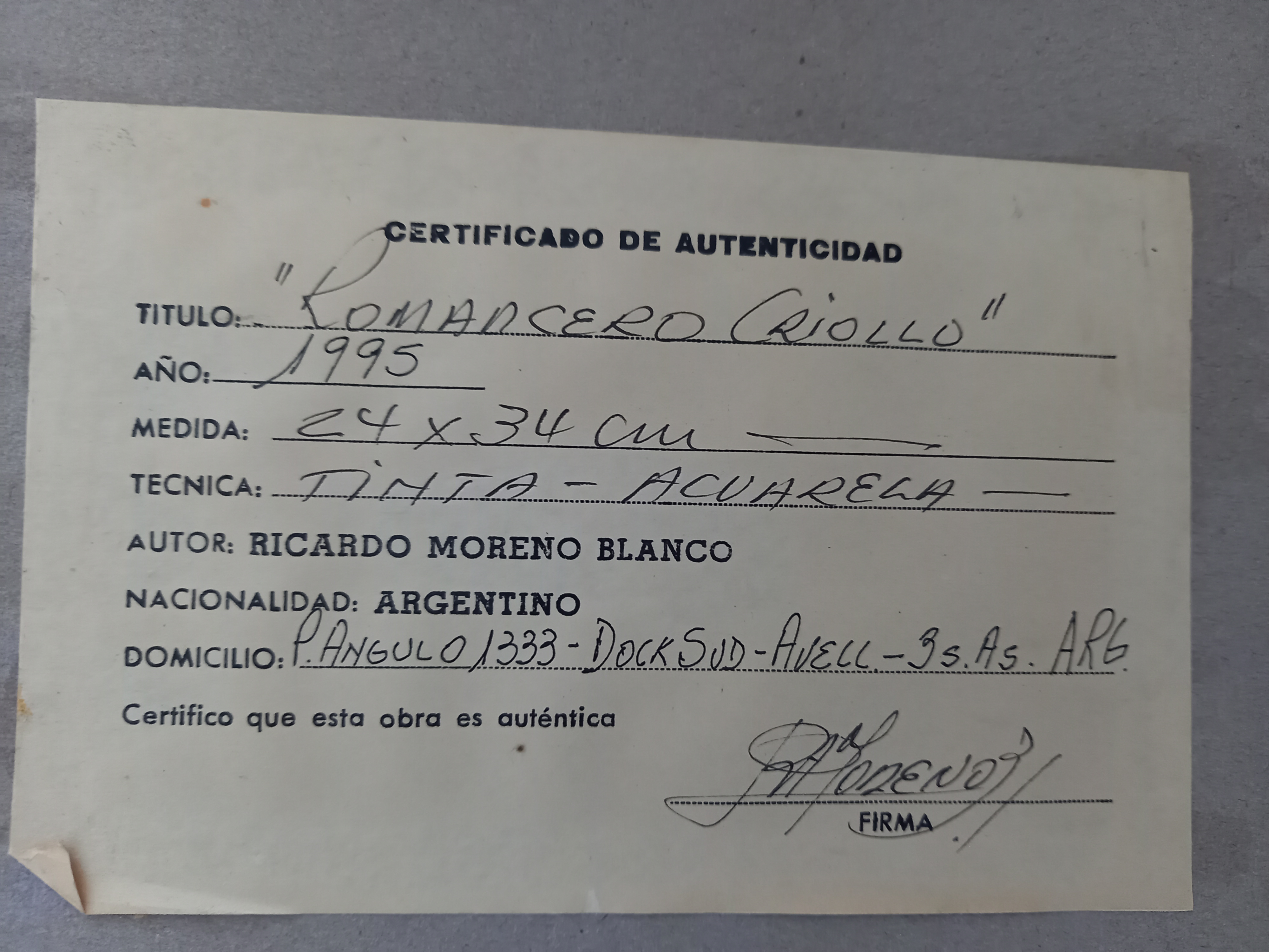 Ricardo Moreno Blanco, nació el 17 de Mayo de 1943 en Pasteur, Argentina. Estudió en la Escuela de Bellas Artes Manuel Belgrano y dedicó varios años a la docencia. Tiene su atelier en la calle Magallanes, No 852, la Calle de los Artistas, a metros del punto más sensible del Barrio La Boca, donde se mezclan los colores del viejo barrio de inmigrantes, los paisajes que pintó Quinquella Martín y la melancolía de la tierra lejana. Sus obras, expuestas permanentemente en la calle Caminito, forman además parte de numerosas Colecciones Privadas en distintos países de todo el mundo.