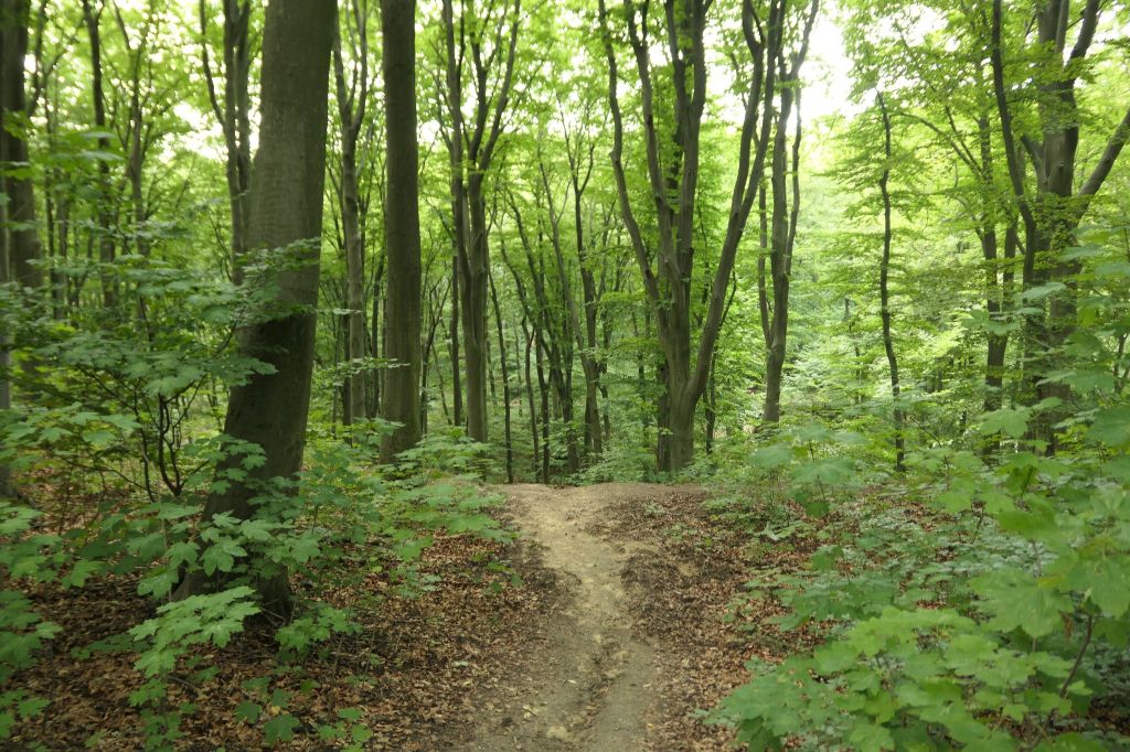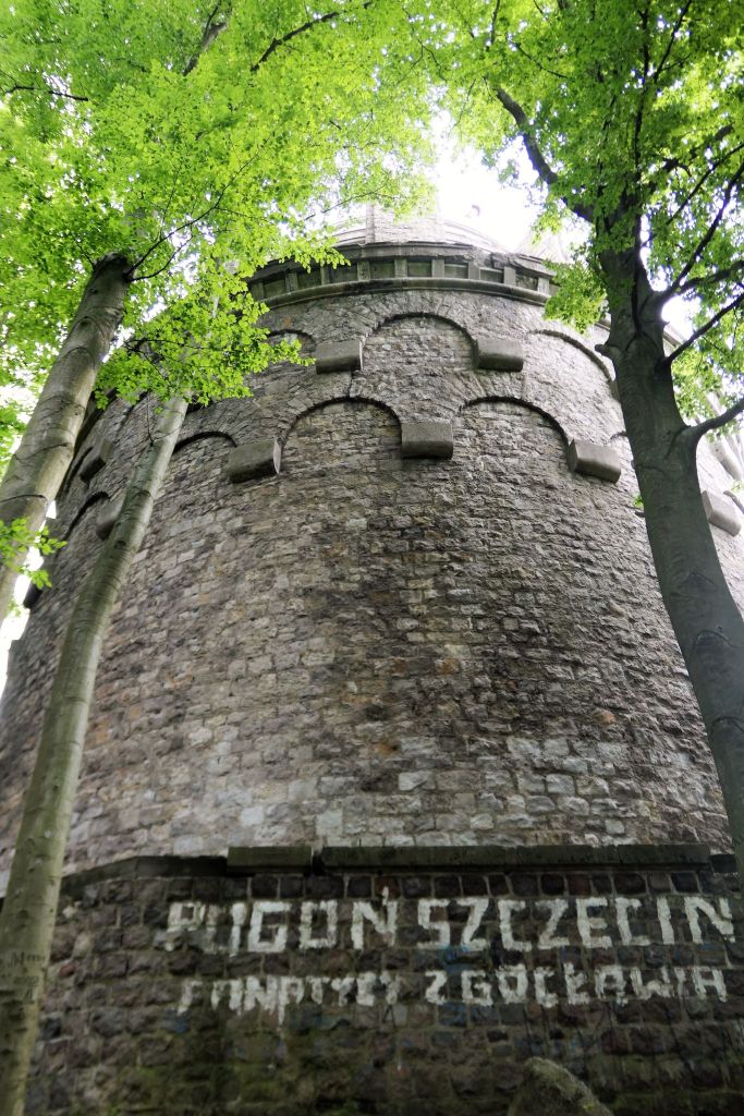 Przechodzę pod bardzo niskim mostem kolejowym, mostem dla krótkich ludzi i fanów Pogoni Szczecin, o czym świadczą napisy po obu stronach mostu. Łagodnym zboczem idę w kierunku ulicy Narciarskiej, później mijam ulicę Górską. Czuję się, jak na górskim szlaku, jest drogowskaz: Wieża Bismarcka.